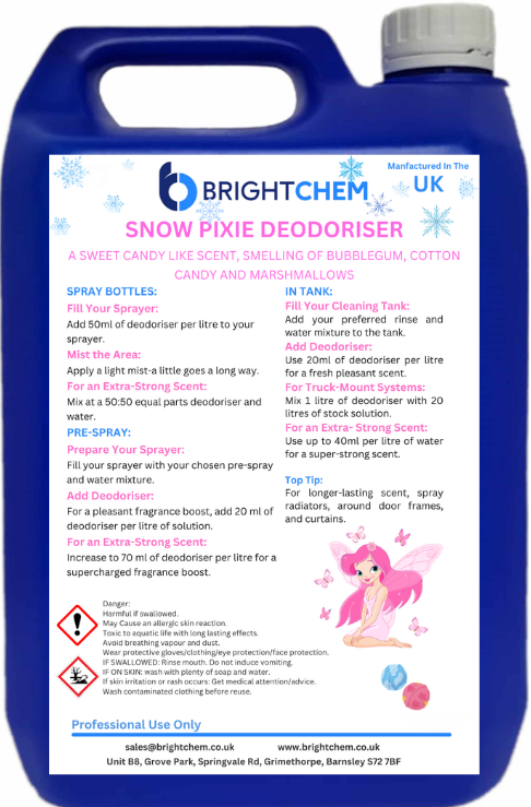 Infuse your spaces with a magical burst of sweetness! BrightChem Snow Pixie Deodoriser is a high-performance, multi-purpose deodoriser that delivers a delightful, long-lasting aroma that’s impossible to forget. With a fragrance inspired by bubblegum, cotton candy, and marshmallows, it’s the perfect way to leave your clients smiling.