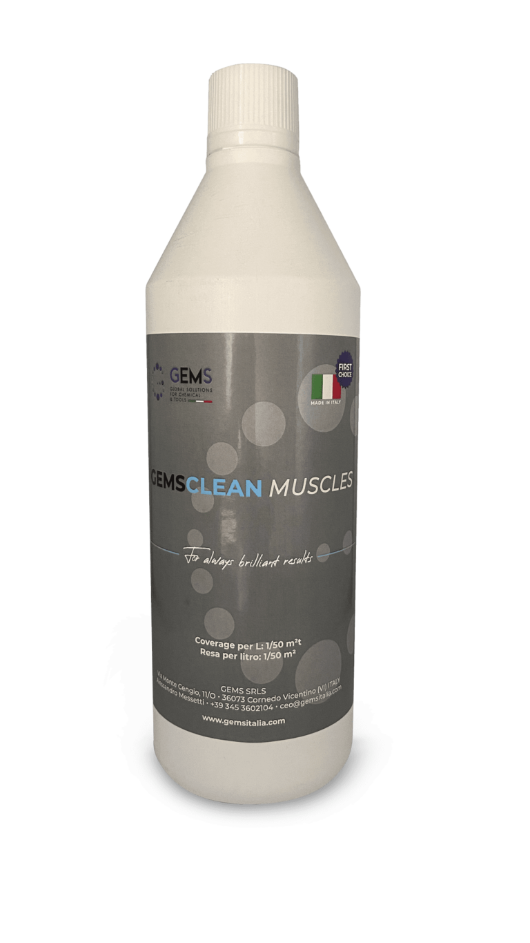 Concentrated detergent, dilutable in water, for the thorough cleaning of any floor surface. GemsClean Muscles effectively dissolves greasy substances, oils, trampling dirt, atmospheric dirt, smoke blackening, food stains. Our cleaner deeply degreases without damaging stone surfaces and is particularly suitable for matt/rough surfaces. It can be used manually or with floor or washer-dryers, it can be diluted in