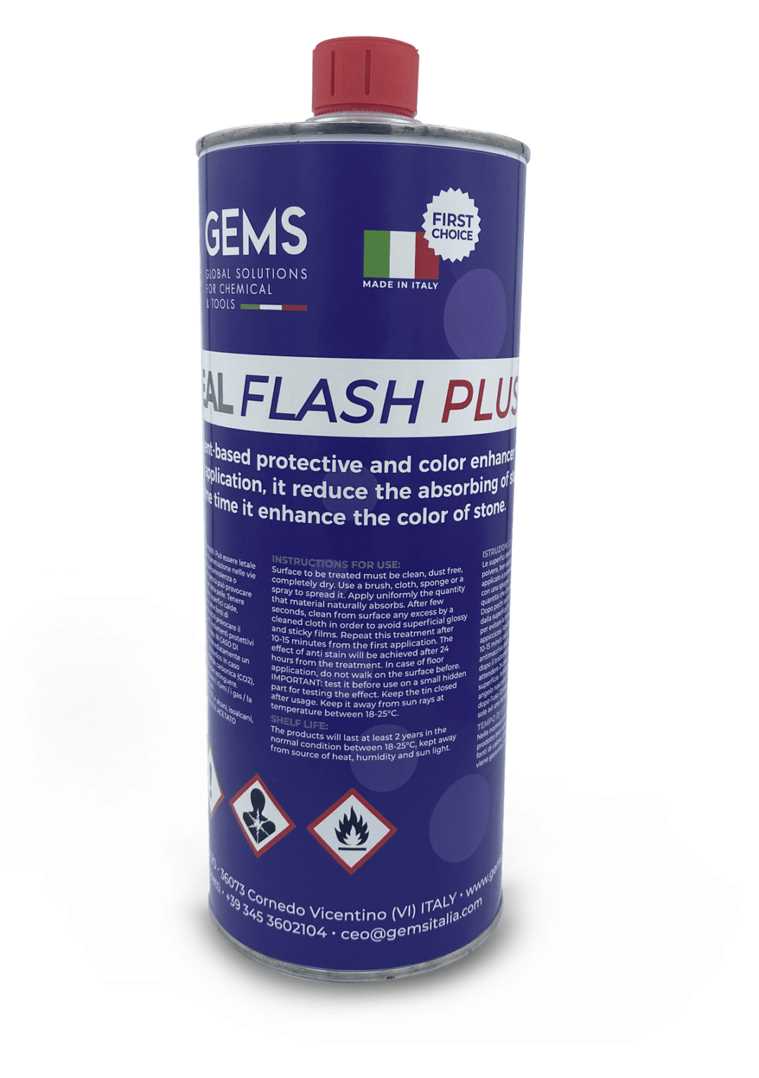 All stone surfaces to be treated must be completely clean and dry. Where no previous treatment experience exists a small discreet area should be tested to verify the suitability of the product to the stone. Where necessary ensure all surrounding areas and surfaces sensitive to solvents are protected against any spillage. Apply one coat of GemSeal Flash Plus evenly with a clean brush, a roller or by cloth in circular movements. On very absorbent surfaces apply a second coat allowing sufficient time for your first application to penetrate into the stone and dry. If in doubt test discreet area to ensure second application is necessary. In case of over treatment or any air bubbles remove by wiping excess product using a clean cotton cloth or absorbent paper. On large floor areas excess residue of product can be buffed off my machine using a white nylon type pad.