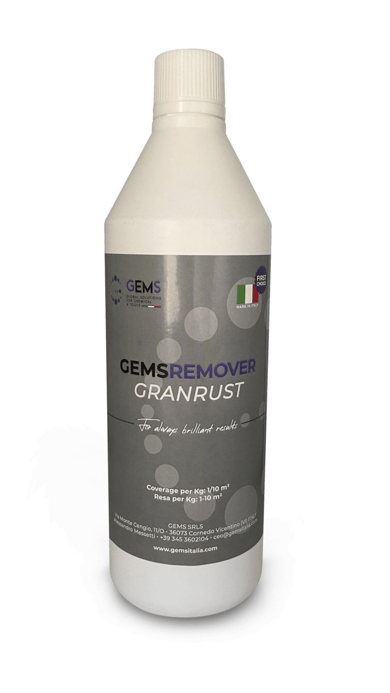 Specific product for removing rust and oxidation from natural stones in general. The product provides an effective action on any type of surface and specifically on materials such as granite, quartzite, serizzo and all those stone materials that have ferrous minerals in their composition which in contact with constant humidity or water present in the laying mixes tend to oxidize giving rise to yellowish halos.